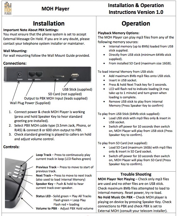 The MOH Message On Hold Player has minimal moving parts, this player will give great value for money and years of operation! MOH Message On Hold Player comes with a one year manufacturers warranty.